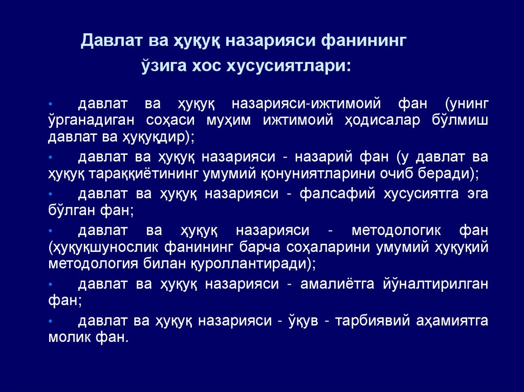 2. Давлат ва ҳуқуқ назарияси фанининг ўзига хос