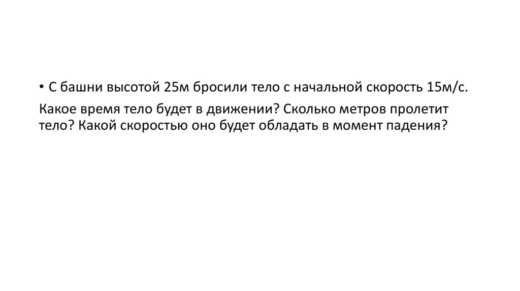 • С башни высотой 25м бросили тело с начальной скорость 15м/с.Какое время тело будет в движении? Сколько метров пролетит