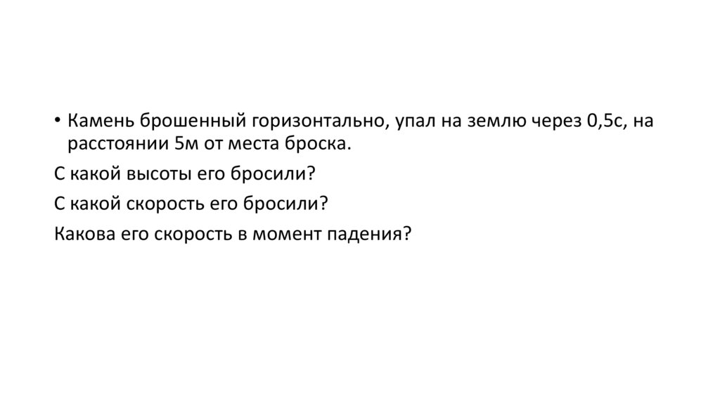 • Камень брошенный горизонтально, упал на землю через 0,5с, нарасстоянии 5м от места броска.