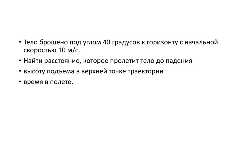 • Тело брошено под углом 40 градусов к горизонту с начальнойскоростью 10 м/с.