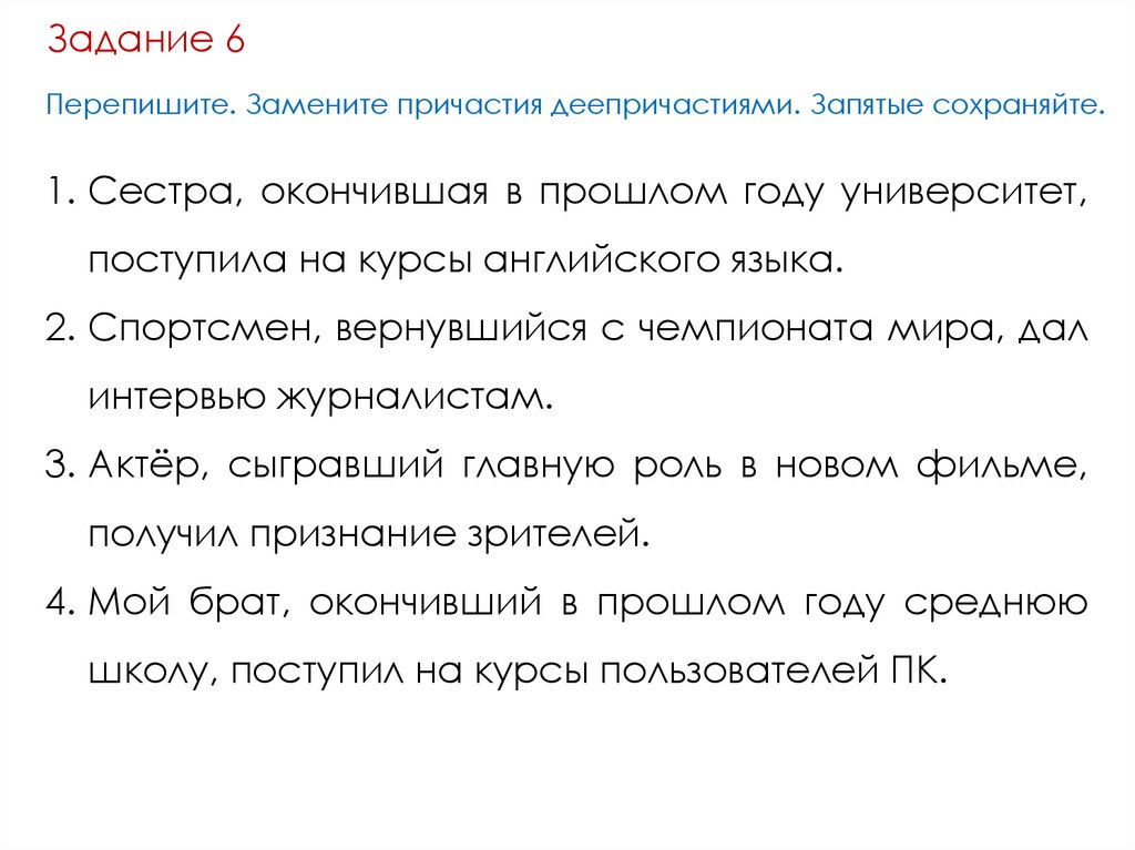 Задание 6Перепишите. Замените причастия деепричастиями. Запятые сохраняйте.