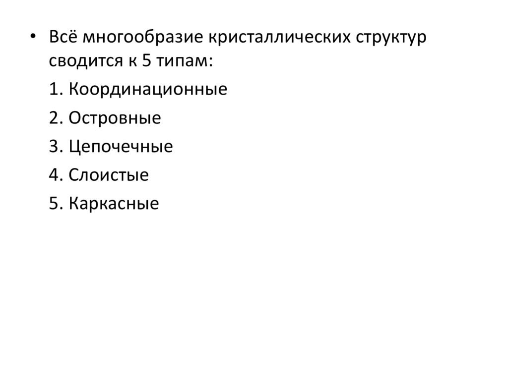 • Всё многообразие кристаллических структурсводится к 5 типам: