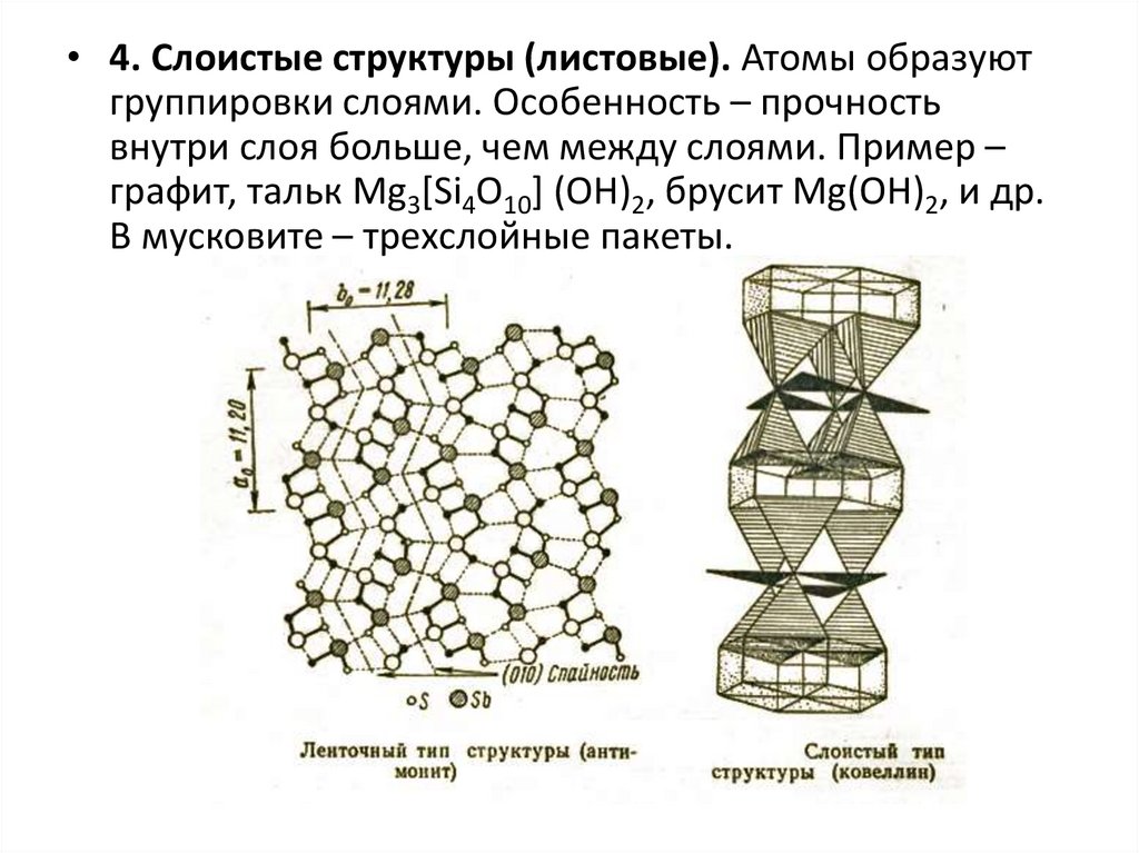 • 4. Слоистые структуры (листовые). Атомы образуютгруппировки слоями. Особенность – прочность