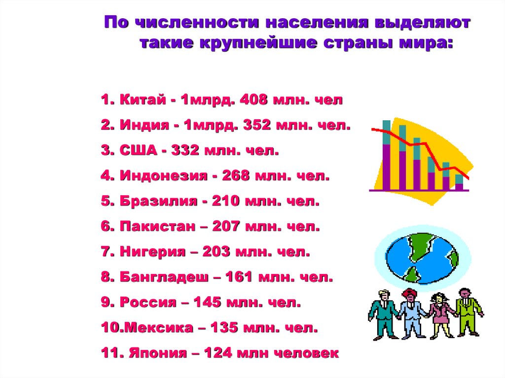 По численности населения выделяюттакие крупнейшие страны мира: