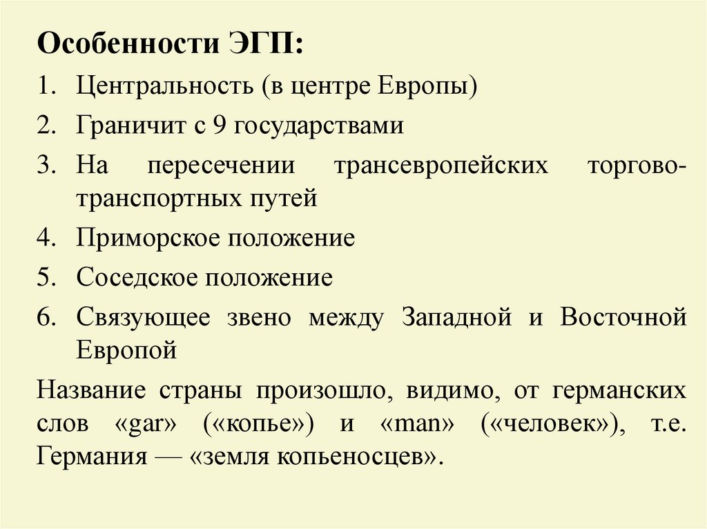 Особенности ЭГП:1. Центральность (в центре Европы)