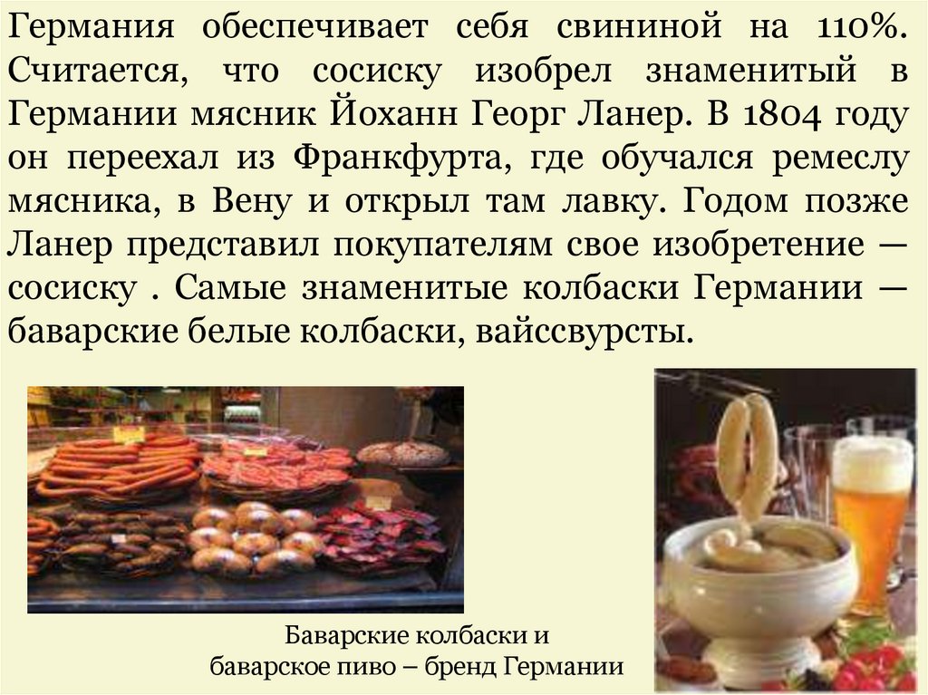 Германия обеспечивает себя свининой на 110%.Считается, что сосиску изобрел знаменитый в