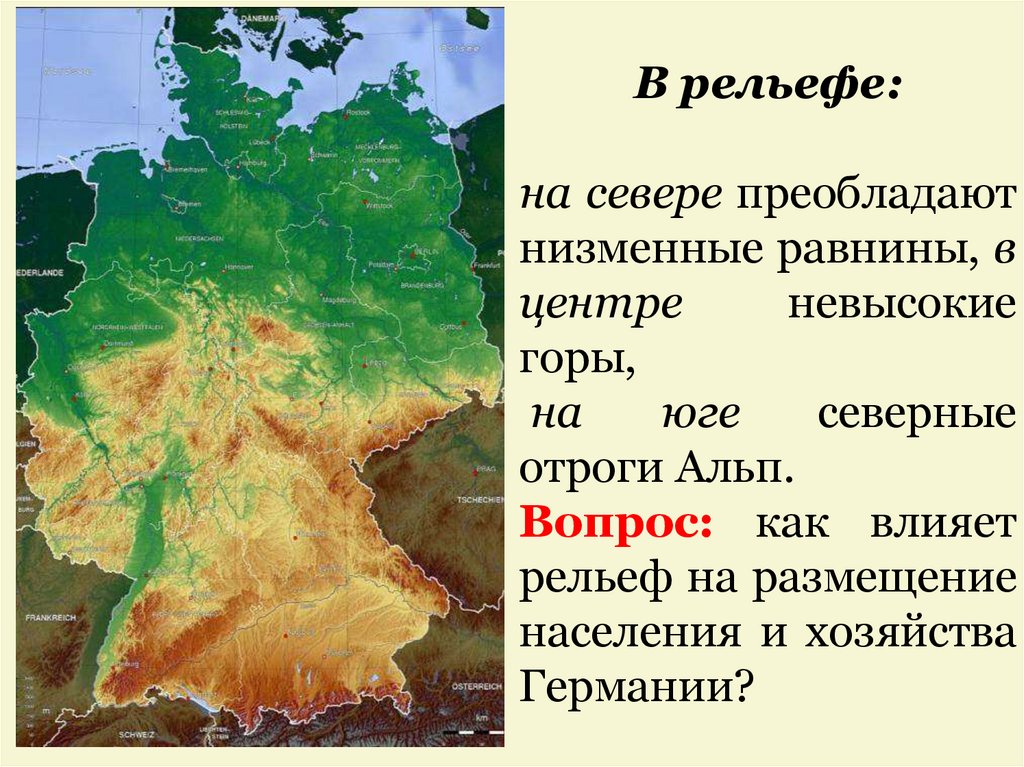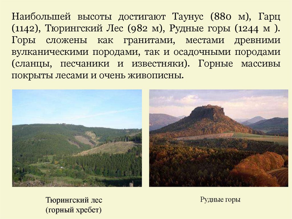Наибольшей высоты достигают Таунус (880 м), Гарц(1142), Тюрингский Лес (982 м), Рудные горы (1244 м ).