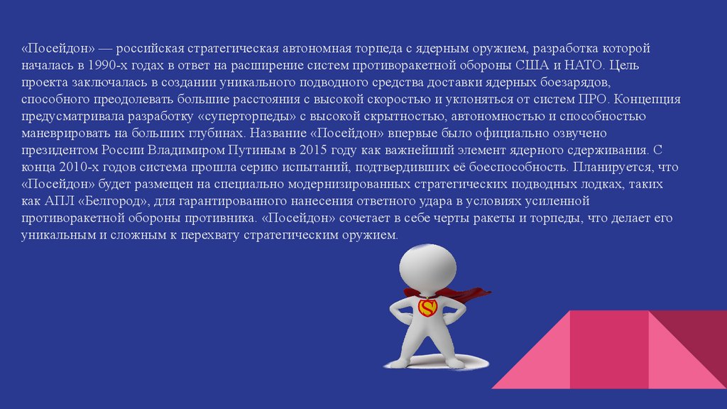 «Посейдон» — российская стратегическая автономная торпеда с ядерным оружием, разработка которойначалась в 1990-х годах в ответ на расширение систем противоракетной обороны США и НАТО. Цель