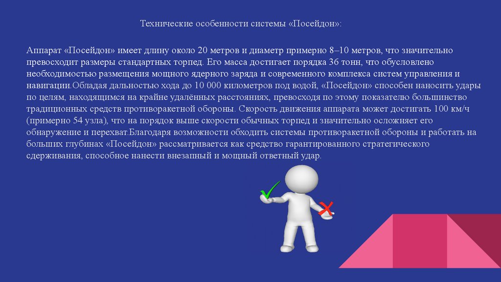 Технические особенности системы «Посейдон»:Аппарат «Посейдон» имеет длину около 20 метров и диаметр примерно 8–10 метров, что значительно