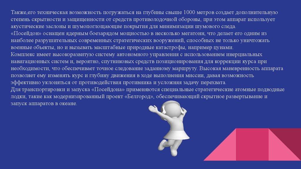 навигации.Обладая дальностью хода до 10 000 километров под водой, «Посейдон» способен наносить удары