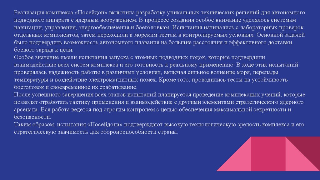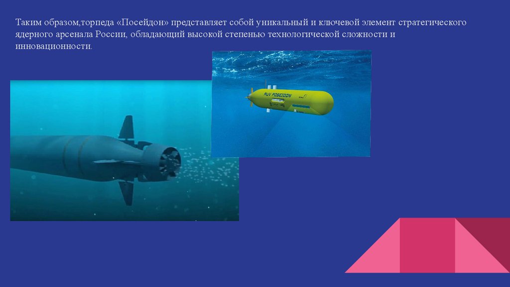 Таким образом,торпеда «Посейдон» представляет собой уникальный и ключевой элемент стратегическогоядерного арсенала России, обладающий высокой степенью технологической сложности и