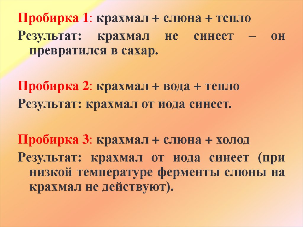 Пробирка 1: крахмал + слюна + теплоРезультат: крахмал не синеет –