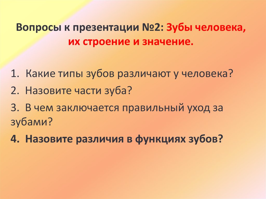 Вопросы к презентации №2: Зубы человека,их строение и значение.