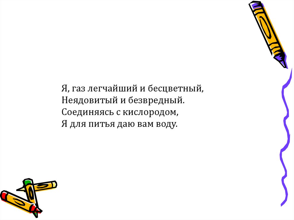 Я, газ легчайший и бесцветный,Неядовитый и безвредный.