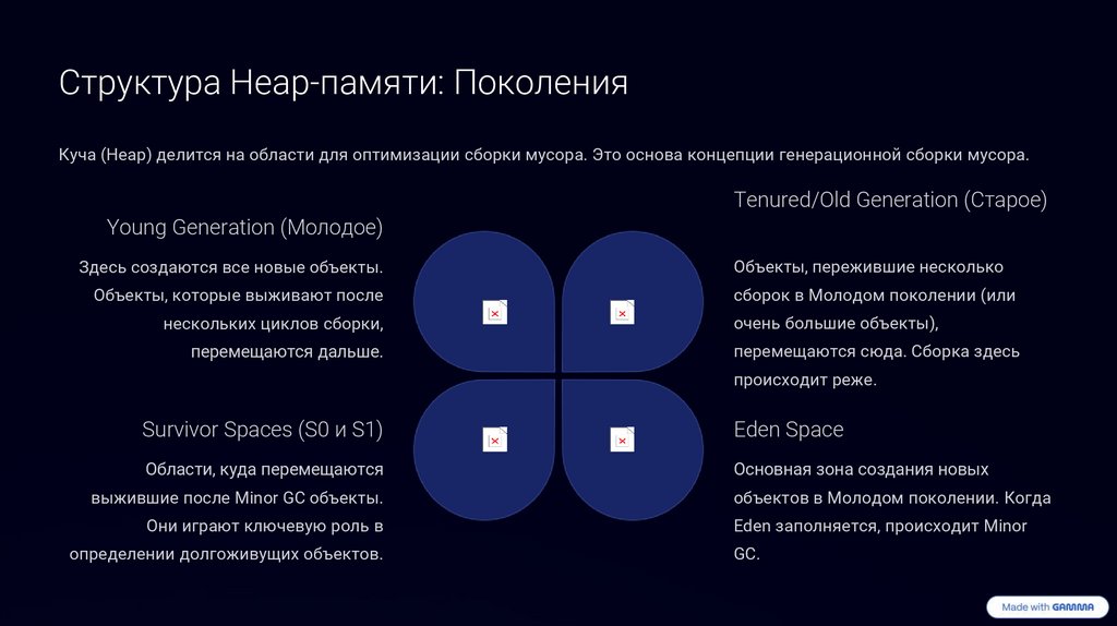 Структура Heap-памяти: ПоколенияКуча (Heap) делится на области для оптимизации сборки мусора. Это основа концепции генерационной сборки мусора.