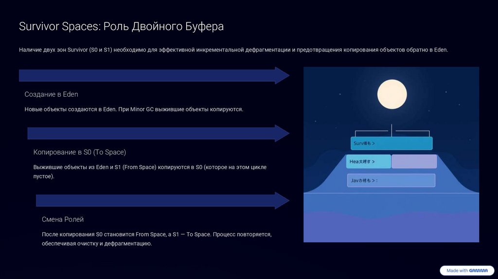 Survivor Spaces: Роль Двойного БуфераНаличие двух зон Survivor (S0 и S1) необходимо для эффективной инкрементальной дефрагментации и предотвращения копирования объектов обратно в Eden.