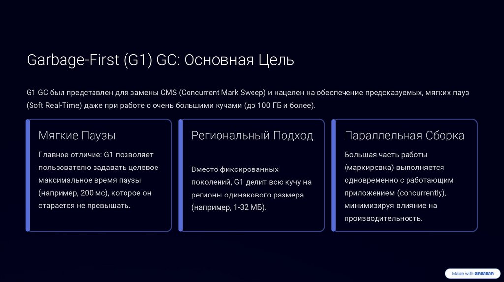 Garbage-First (G1) GC: Основная ЦельG1 GC был представлен для замены CMS (Concurrent Mark Sweep) и нацелен на обеспечение предсказуемых, мягких пауз