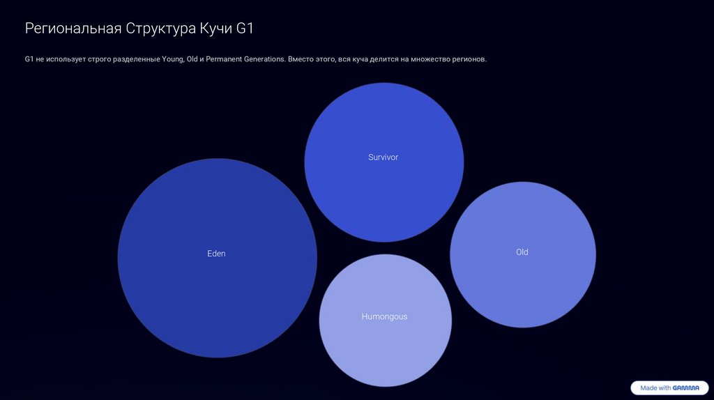Региональная Структура Кучи G1G1 не использует строго разделенные Young, Old и Permanent Generations. Вместо этого, вся куча делится на множество регионов.