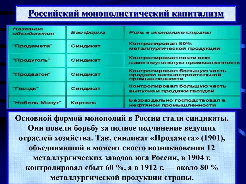 Российский монополистический капитализмОсновной формой монополий в России стали синдикаты.