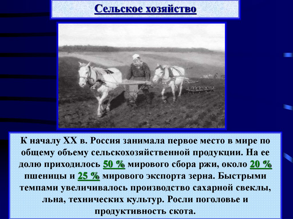 Сельское хозяйствоК началу XX в. Россия занимала первое место в мире по