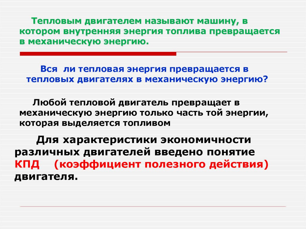 Тепловым двигателем называют машину, вкотором внутренняя энергия топлива превращается