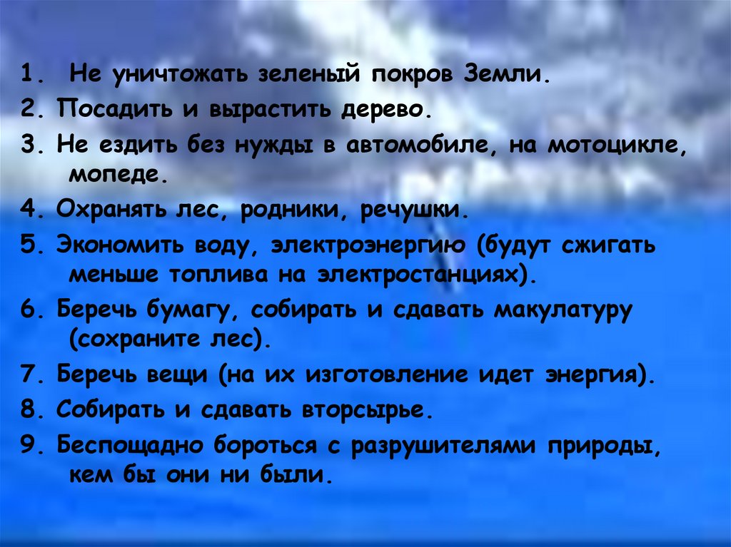 1. Не уничтожать зеленый покров Земли.2. Посадить и вырастить дерево.