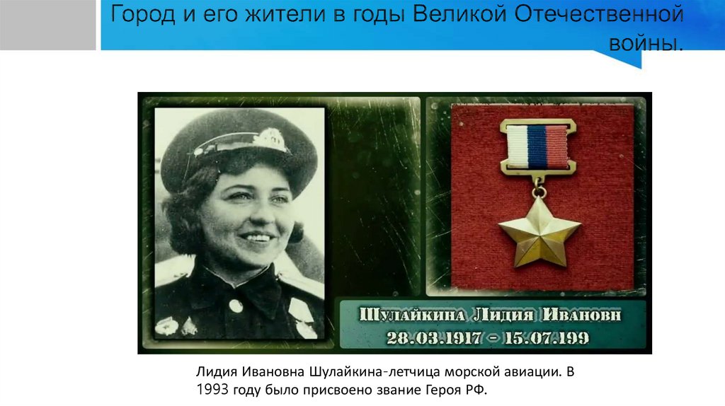 Лидия Ивановна Шулайкина-летчица морской авиации. В1993 году было присвоено звание Героя РФ.