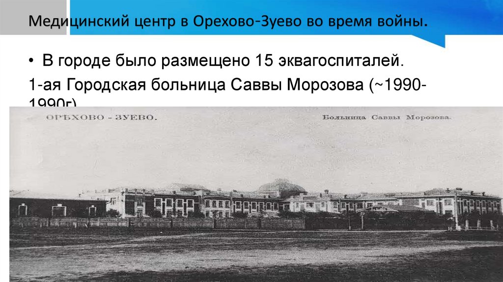 Медицинский центр в Орехово-Зуево во время войны.• В городе было размещено 15 эквагоспиталей.