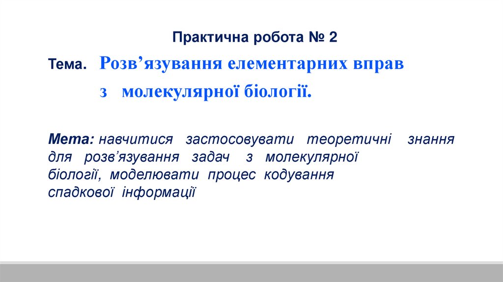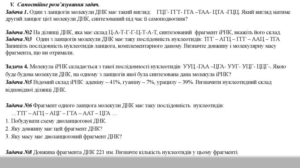 V. Самостійне розв’язування задач.Задача 1. Один з ланцюгів молекули ДНК має такий вигляд: ГЦГ- ГГТ- ГГА –ТАА- ЦТА -ГЦЦ. Який вигляд матиме