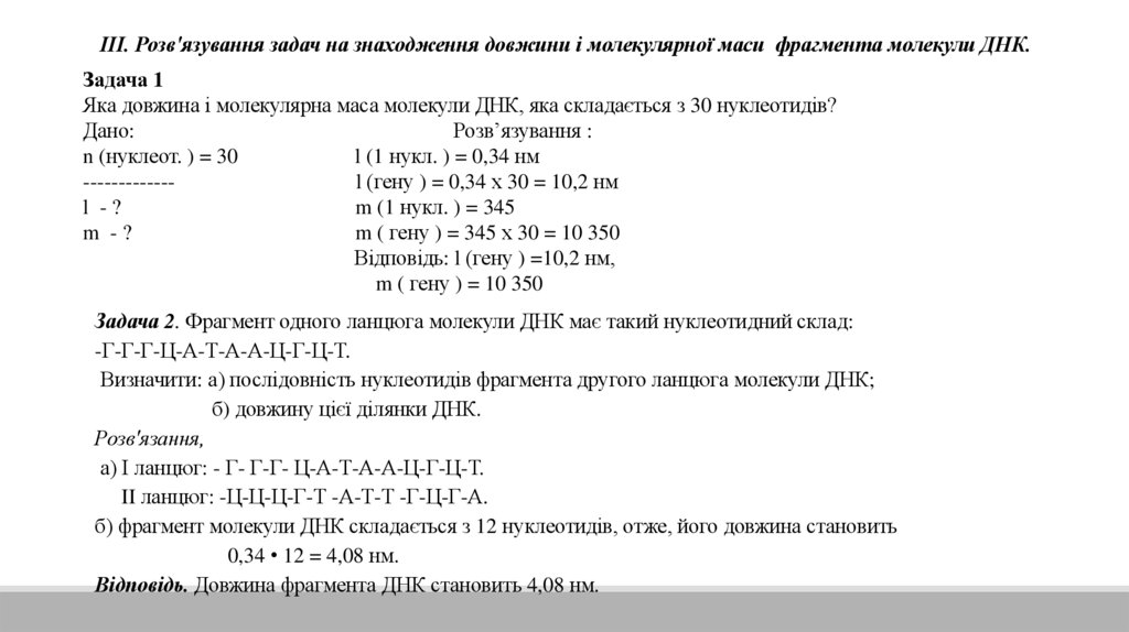 ІІІ. Розв'язування задач на знаходження довжини і молекулярної маси фрагмента молекули ДНК.Задача 1