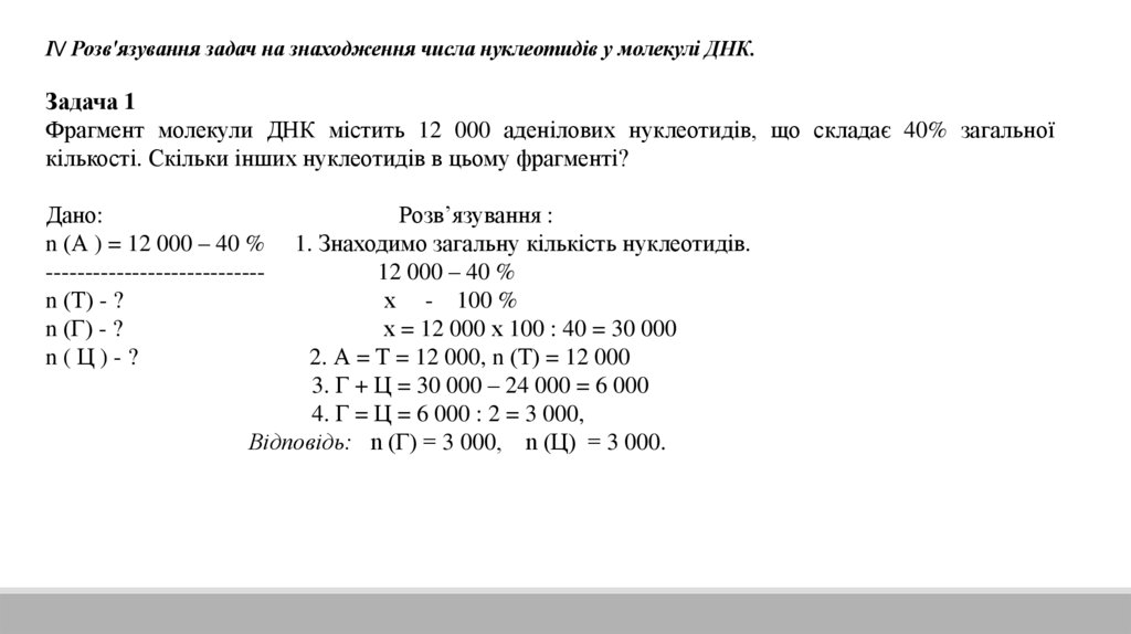 І\/ Розв'язування задач на знаходження числа нуклеотидів у молекулі ДНК.Задача 1