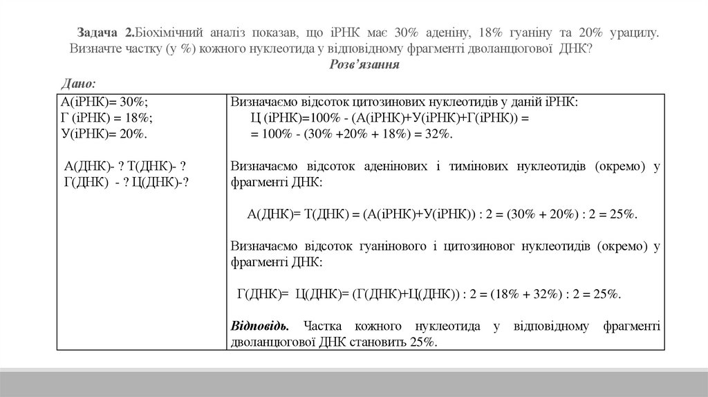 Задача 2.Біохімічний аналіз показав, що іРНК має 30% аденіну, 18% гуаніну та 20% урацилу.Визначте частку (у %) кожного нуклеотида у відповідному фрагменті дволанцюгової ДНК?