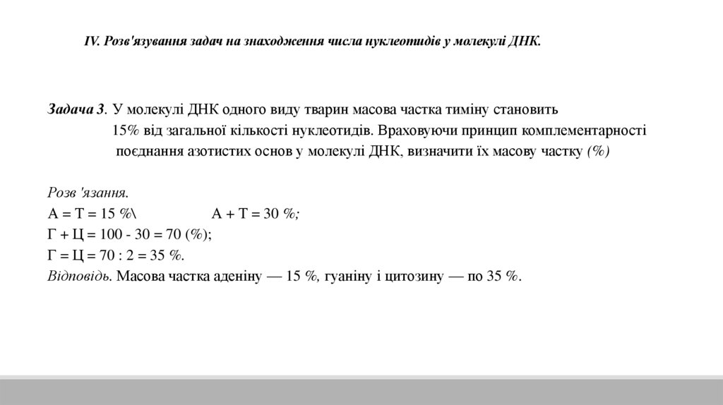 IV. Розв'язування задач на знаходження числа нуклеотидів у молекулі ДНК.Задача 3. У молекулі ДНК одного виду тварин масова частка тиміну становить