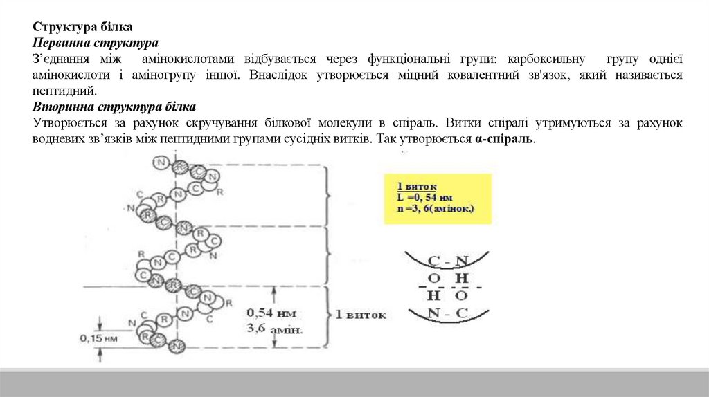 водневих зв’язків між пептидними групами сусідніх витків. Так утворюється α-спіраль.