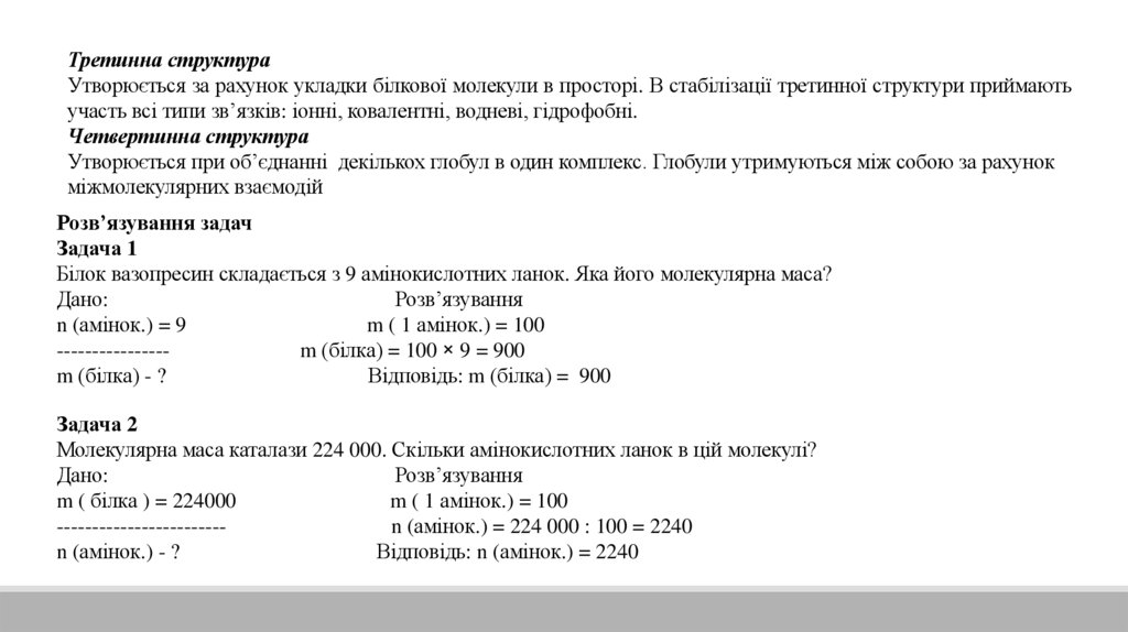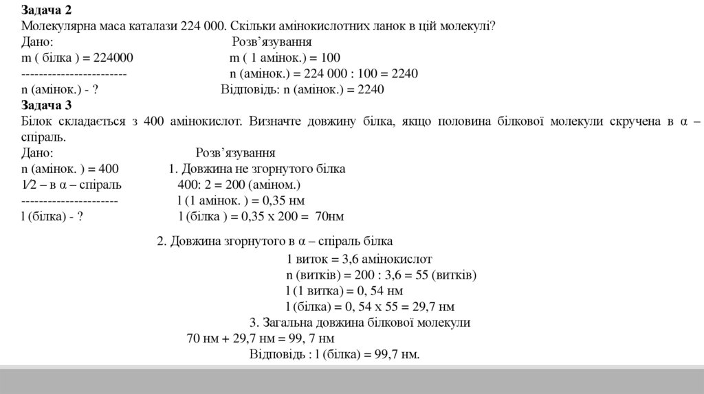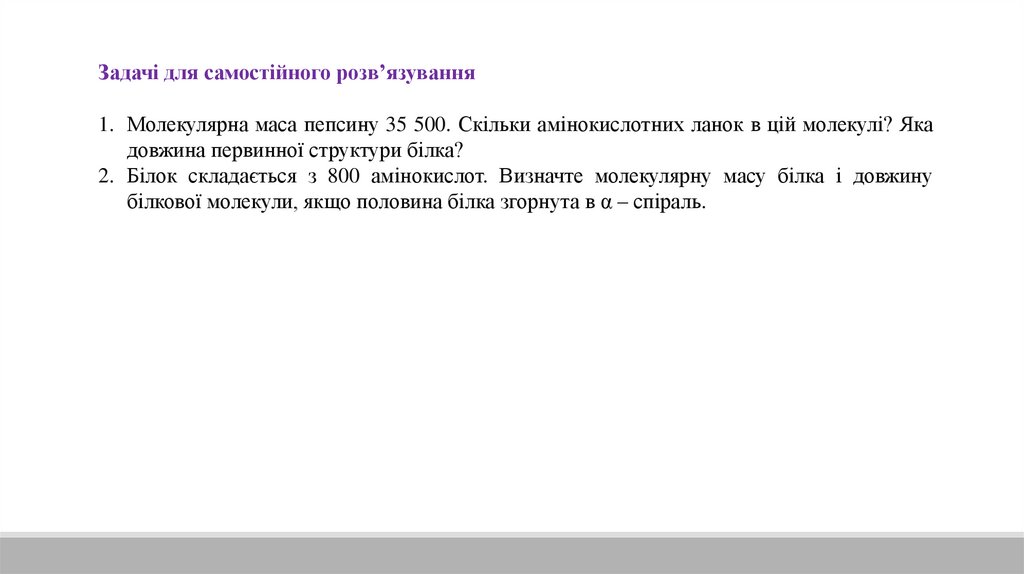 Задачі для самостійного розв’язування1. Молекулярна маса пепсину 35 500. Скільки амінокислотних ланок в цій молекулі? Яка