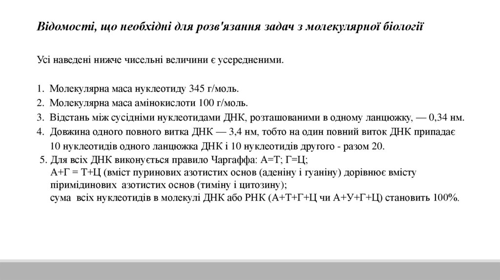 Відомості, що необхідні для розв'язання задач з молекулярної біологіїУсі наведені нижче чисельні величини є усередненими.