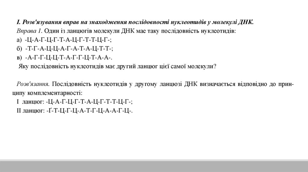 I ланцюг: -Ц-А-Г-Ц-Г-Т-А-Ц-Г-Т-Т-Ц-Г-;