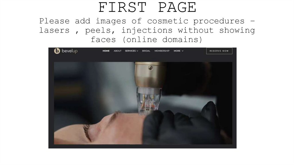 1. FIRST PAGE Please add images of cosmetic procedures – lasers , peels, injections without showing faces (online domains)