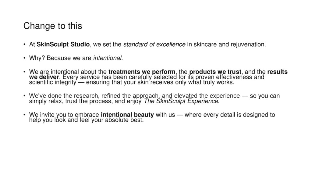 Change to this• At SkinSculpt Studio, we set the standard of excellence in skincare and rejuvenation.