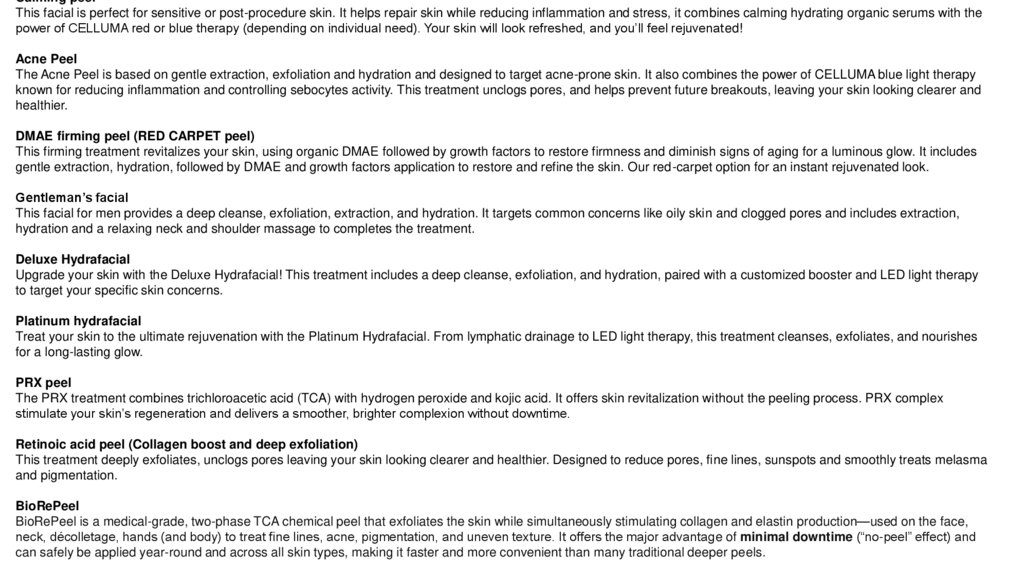 Calming peelThis facial is perfect for sensitive or post-procedure skin. It helps repair skin while reducing inflammation and stress, it combines calming hydrating organic serums with the