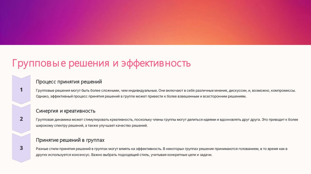 Однако, эффективный процесс принятия решений в группе может привести к более взвешенным и всесторонним решениям.
