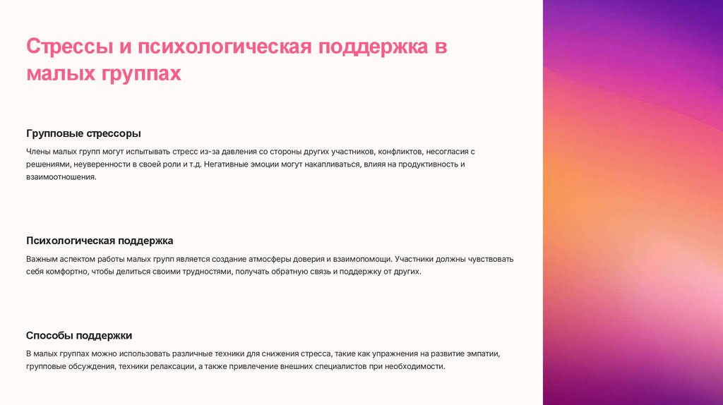 В малых группах можно использовать различные техники для снижения стресса, такие как упражнения на развитие эмпатии,