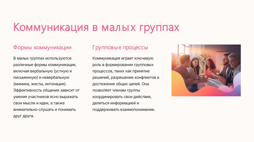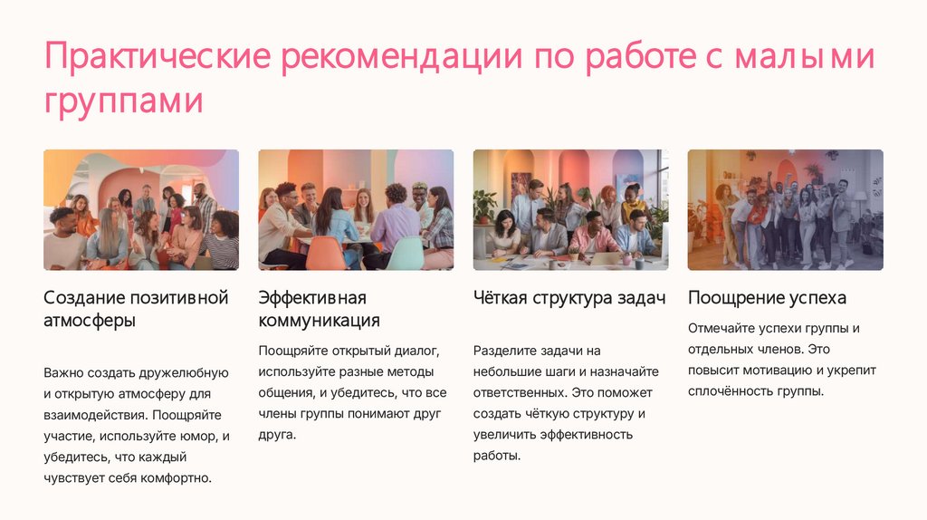 Важным аспектом работы малых групп является создание атмосферы доверия и взаимопомощи. Участники должны чувствовать