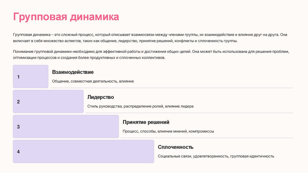 Групповая динамикаГрупповая динамика – это сложный процесс, который описывает взаимосвязи между членами группы, их взаимодействие и влияние друг на друга. Она
