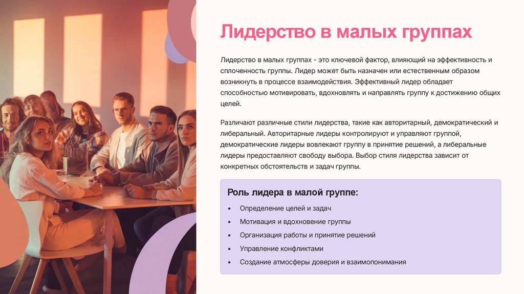 Лидерство в малых группахЛидерство в малых группах - это ключевой фактор, влияющий на эффективность и