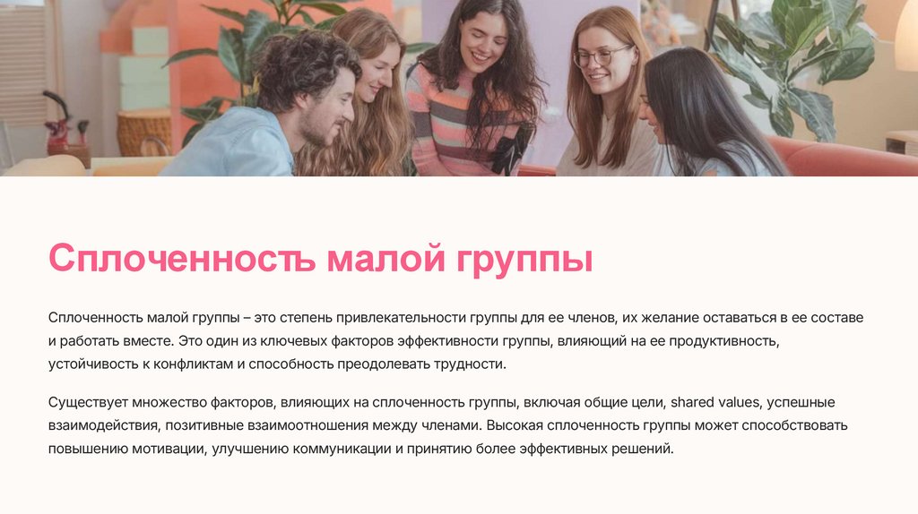 Существует множество факторов, влияющих на сплоченность группы, включая общие цели, shared values, успешные