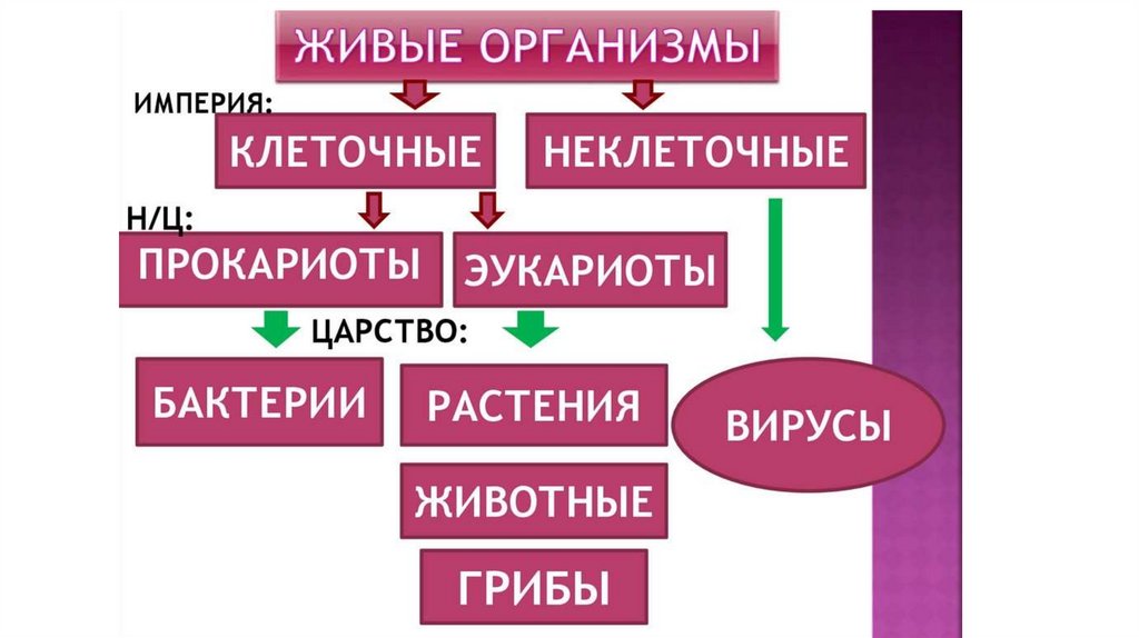 7 царств: Архебактерии, Бактерии, Протисты, Хромисты,Грибы, Растения, Животные.