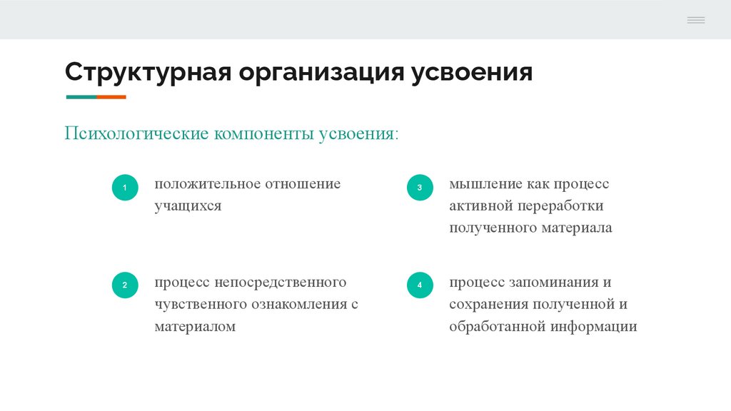 Структурная организация усвоенияПсихологические компоненты усвоения: