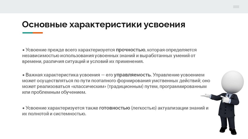 • Важная характеристика усвоения — его управляемость. Управление усвоением