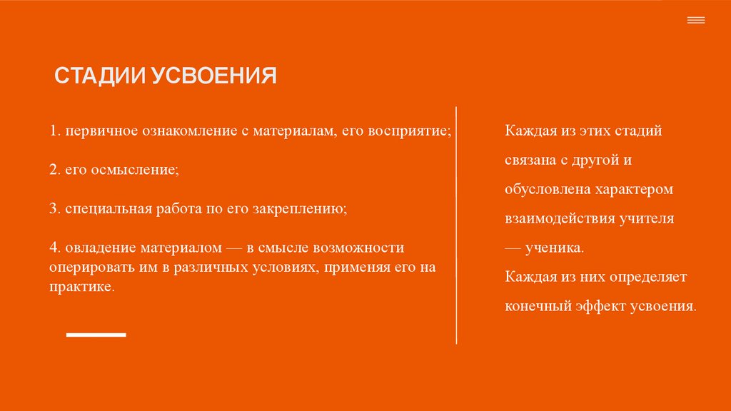 СТАДИИ УСВОЕНИЯ1. первичное ознакомление с материалам, его восприятие;